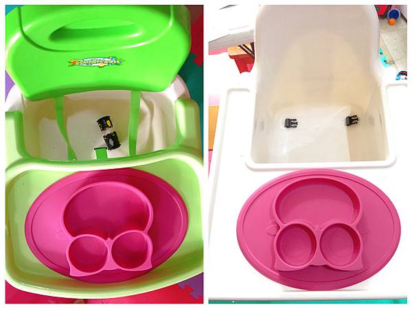 ①ikea高腳兒童餐②費雪攜帶式餐椅,因為貓頭鷹的底盤較大,2款桌面放上去剛好塞的下