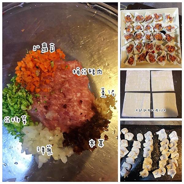材料:梅花豬絞肉、紅蘿蔔末、花椰菜末、洋蔥末、木耳末、薑泥、醬油、鹽