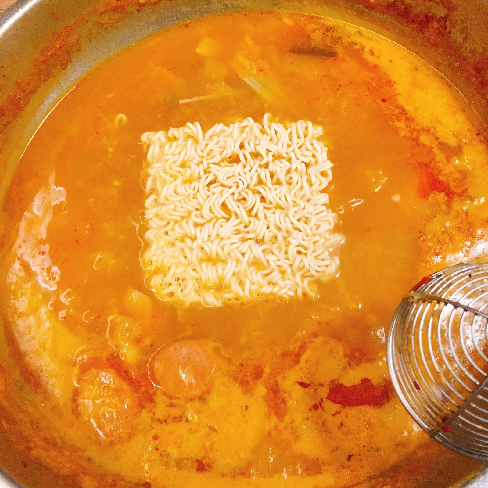 ▼韓式部隊泡菜鍋(韓式雞腿、年糕、德國香腸、起司片、娃娃菜)