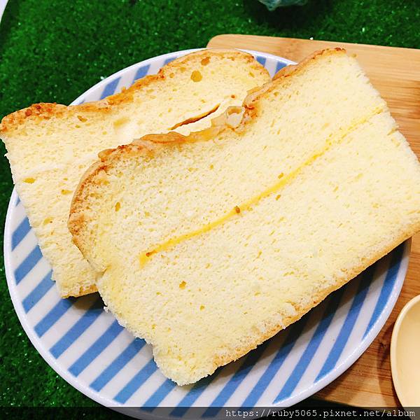 一口咬下先是蛋香,慢慢地留在嘴裡的是微微的豆香~與一般古早味蛋糕有著不同的風味