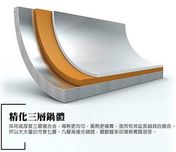 GZero系列創業界特例,採用高厚度三層複合金熱壓鑄鍋體,導熱更均勻,蓄熱更確實,進而有效延長鍋具的壽命。