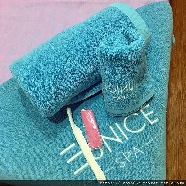 床上有EUNICE SPA 準備的浴巾、毛巾、浴帽、免洗丁字褲