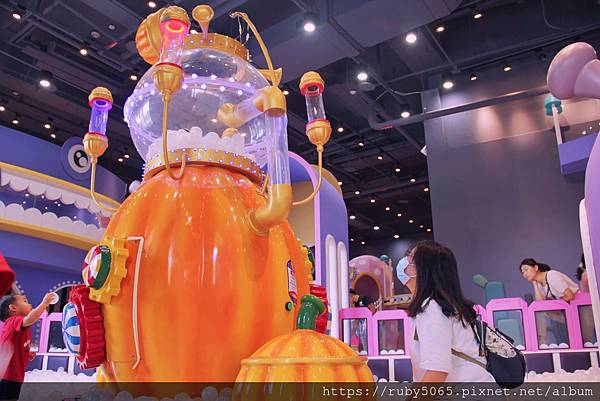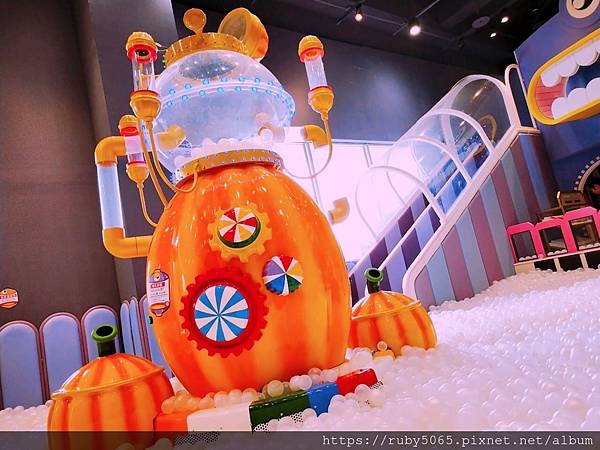 魔法南瓜噴球機 將代表歡樂的球送進去接收器裡,然後倒數5、4、3、2、1 能源撒下的那一瞬間,孩子們被小球淋浴超級開心的!!
