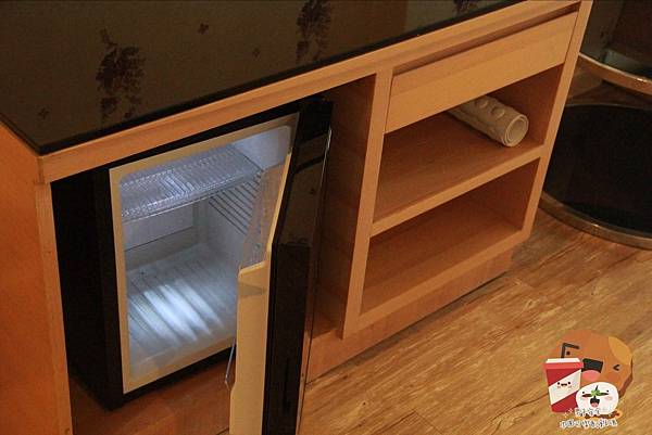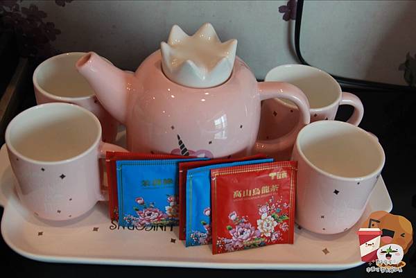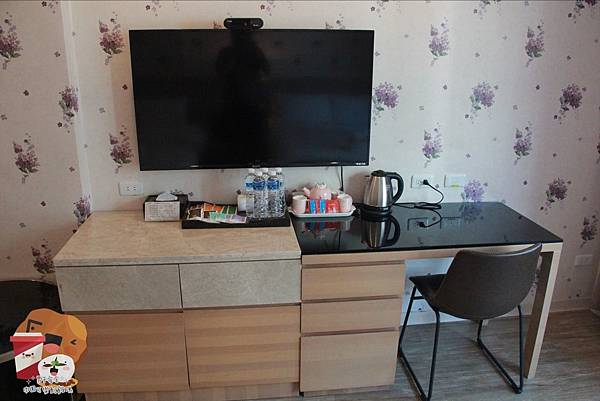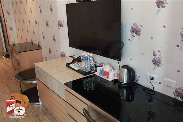 房內有50吋大電視、小冰箱、礦泉水、茶包,茶具組超可愛的