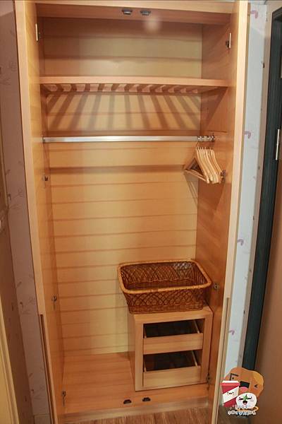 衣櫃內吊掛衣物下方有籃子、拖鞋,可供旅客使用。