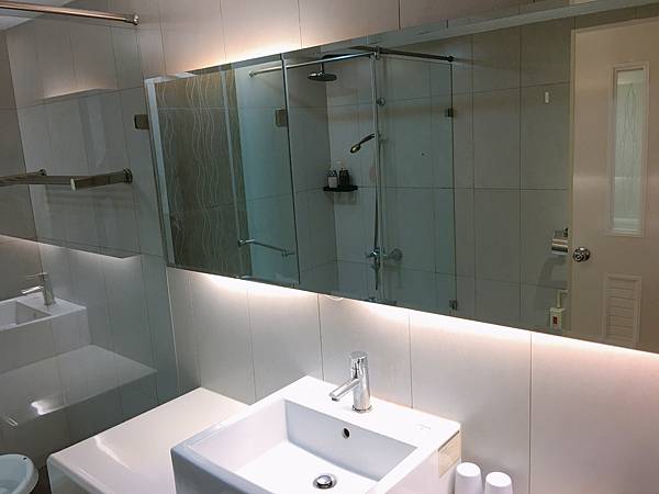 衛浴設備內有長型大鏡面、乾濕分離的淋浴間、清潔用品也很齊全