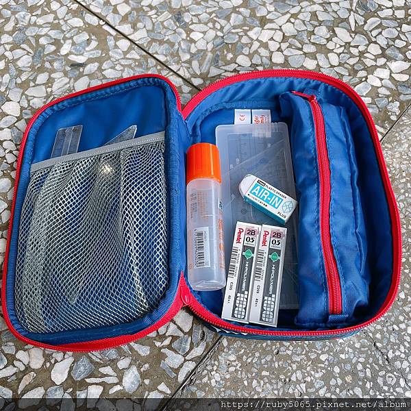 左邊網袋隔層設計可以放直尺、三角尺、量角器、剪刀等物品
