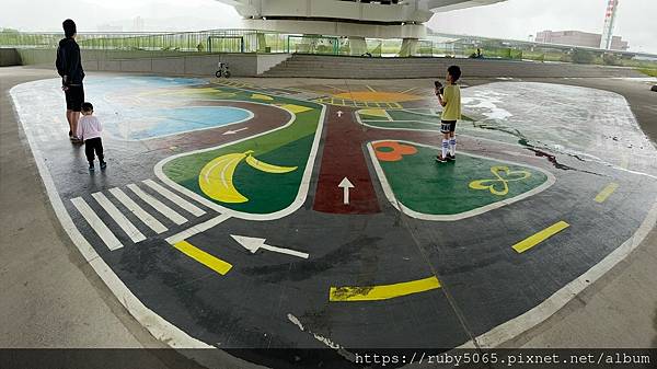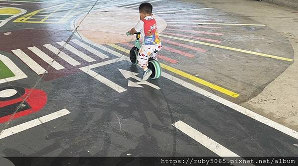 這區的地板 彩繪了 很童趣的道路圖案,需要練習自行車、滑步車、滑板車都可以來這裡喔~~