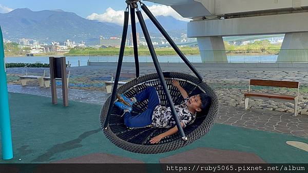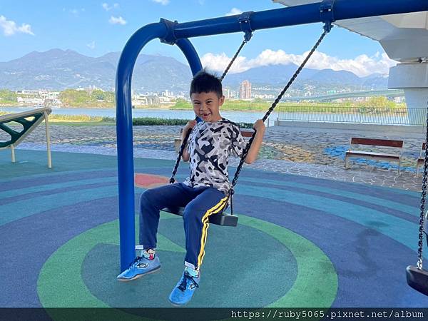我最喜歡來這裡盪鞦韆了,因為肉圓哥自己盪鞦韆時,我還能在旁邊與可樂一同乘坐親子鞦韆大家都玩的到。