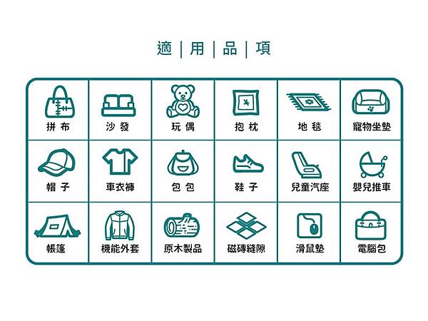 適用品項也很多元,鞋子、帽子、嬰兒推車、包包、滑鼠墊....等都可以使用。