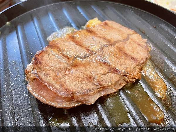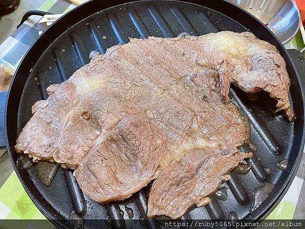 美國安格斯比臉大牛排 還好我的電烤盤還放得下牛排,真的超大的。牛排偏薄,不過肉質部分一樣好吃