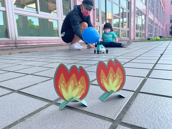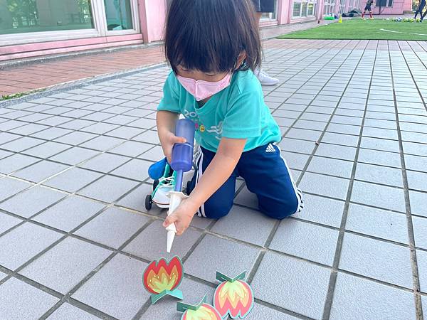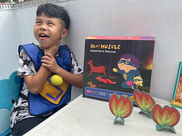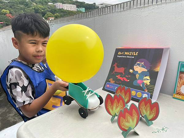 透過「神奇隊長與飛天小雞」的故事與搶救森林大火的任務,將肌肉能量與動力具象化,再製作氣球動力車加深印象,
