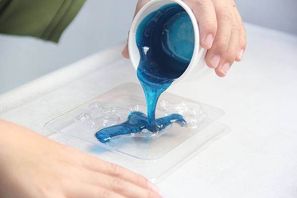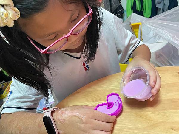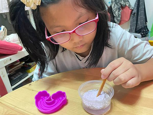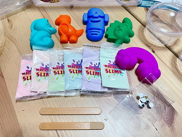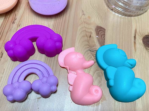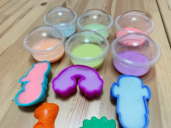 除了單純拉伸、延展之外,將粉和水混合攪拌後,倒入矽膠模型裡面,10-15分鐘就可以取出QQ史萊姆。本組合富有4包史萊姆粉以及6款矽膠無毒模具。